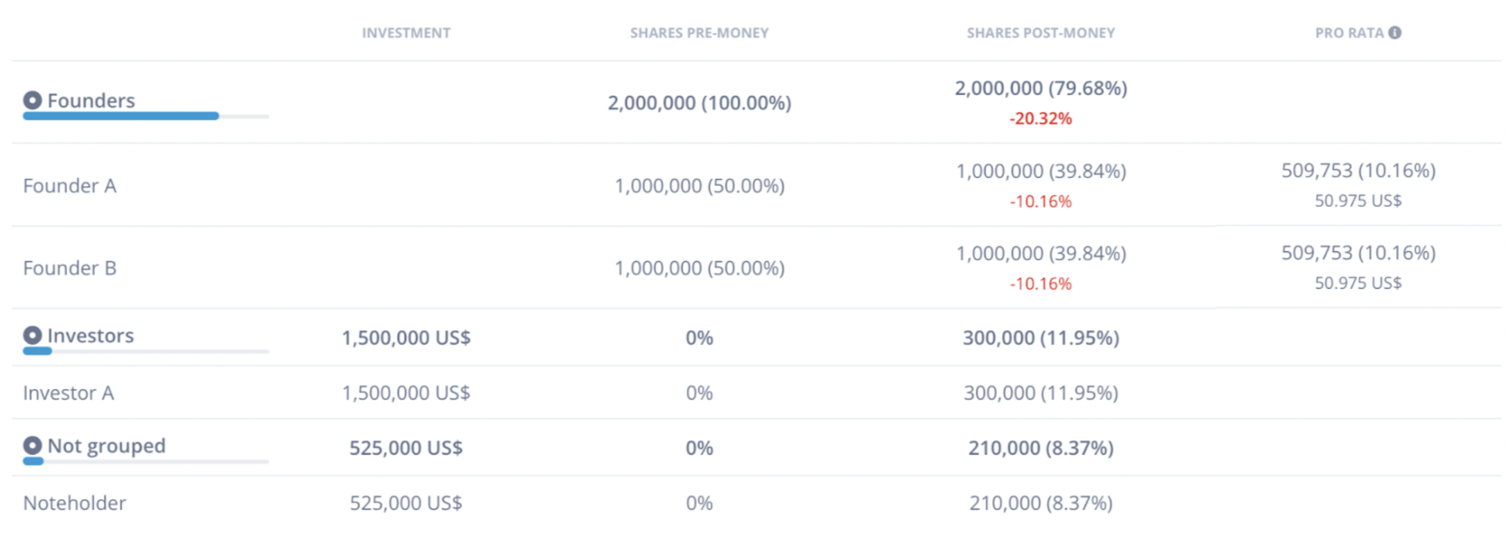 After the new investors receive their equity stakes, the founders are diluted by a total of 20.32%. The new investor receives 11.95% of the equity, which represents 300 000 shares. In turn, the early investor that converted its note into shares owns 8.37% of the company’s equity and that is 210 000 shares.