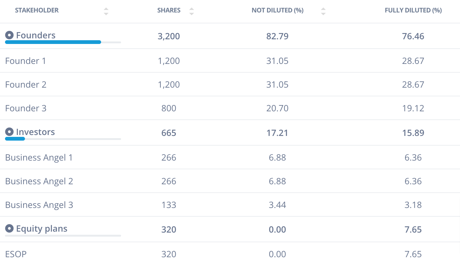 The capital increase has a direct dilution, and leaves the founders with 3,200 shares but 82.79% of the undiluted share capital. Instead, the entrepreneurs would have 76.46% of the company fully diluted.